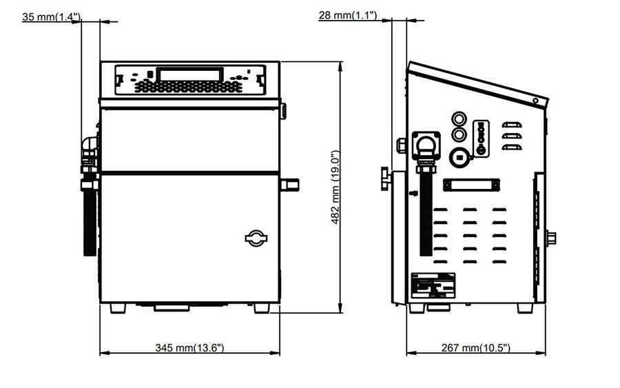 Information storage 50 complex information. Use USB unlimited storage. Standard USB with logo and memory backup. Protection level IP43; stainless steel cabinet Nozzle Heating nozzleDiameter: 1.6" (41.3 mm) Length: 9.5" (241.0 mm) Throat Super flexible Length: 6.56' (2 m) Diameter: 0.91" (23 mm) Bending radius: 3.0" (76.2 mm) Ink cartridge Ink smart ink cartridge: 0.793 qt (750 ml) solvent smart ink cartridge: 0.793 qt (750 ml) temperature range41°F to 113°F (5°C – 45 °C) Electrical requirements Nominal power supply 100-120 / 200-240 VAC, 50/60 Hz, 90 W About weight Unpackaged and dry weight: 35.28 lbs. (16 kg) Optional Electric eye interface Shaft encoder interface 9.8 ft (3 m) hose 60 or 70 micron nozzle |